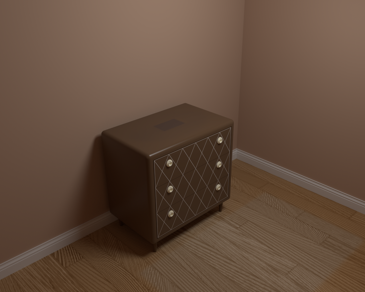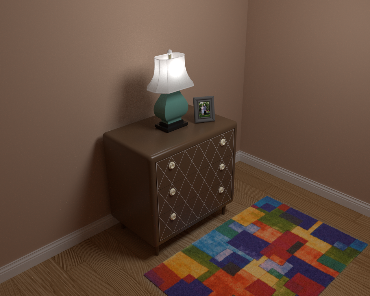 Simulation of Fading Affecting Different MaterialsSequence of images depicting a scene in which a dresser, rug, and wood floor are subjected to light exposure over the course of several years.